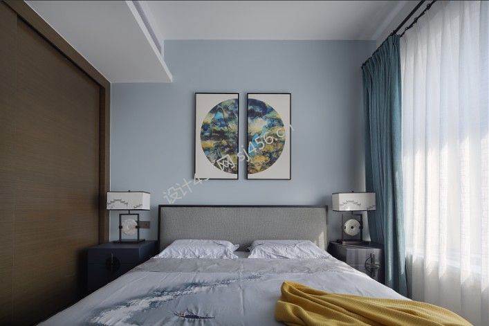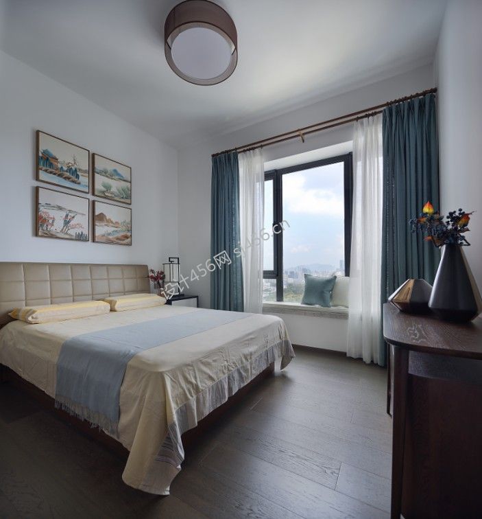 新中式风格三居室卧室飘窗窗帘装修效果图片