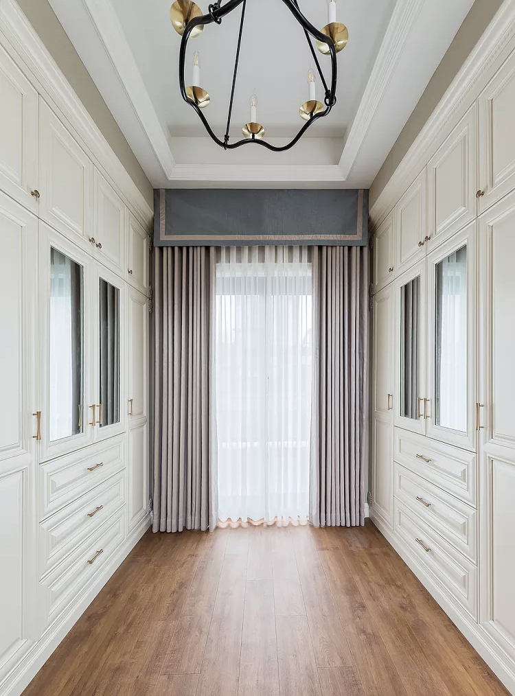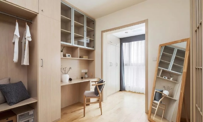 独立式式衣帽间与开敞式衣帽间不同,它是相对一个比较独立的空间。如果家中面积足够大,那么可以考虑设计一个独立式的衣帽间,蕞好将衣帽间设计在卫生间旁边,洗完澡就可以直接在衣帽间寻找自己要穿的衣物,直接换装,非常方便。