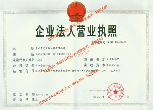 重庆千度装饰工程有限公司于 2005年成立,是一家具有设计和施工双资质的重庆知名品牌装饰企业。 千度企业在重庆地区现已拥有二个全资公司重庆千度装饰工程、重庆康田家私、重庆千度空间广告;四个合资公司及分公司、重庆千度管理有限公司、重庆普盈科技有限公司,千度装饰云阳分公司、黔江分公司、石柱分公司、成都分公司,全国其它地方加盟装饰工程公司。 千度企业秉着成为“重庆装饰第一放心品牌”的目标,历经6年的时间,为企业赢得了众多荣誉,先后获得了“守合同、重信用单位”、“信得过企业”“诚信经营品牌公司”“重庆装饰行业第一放心品牌”等等荣誉称号。 重庆千度装饰工程有限公司是专业从事室内外装饰装修的企业,具有国家装饰装修专业承包二级资质,业务包括:住宅装饰、公寓装饰、别墅装饰、娱乐空间装饰、办公室装饰、陈列展览装饰、火锅城装饰、中餐厅装饰、茶楼装饰、宾馆装饰等装饰工程的设计与施工。千度装饰公司拥有一流的设计队伍,主任设计师具有 5 年以上的从业资历,装饰设计总监、首席装饰设计师均为国家二级注册师,装饰从业资历3-12年,可以满足客户家居办公环境个性化配置的需求。千度装饰创新推出放心品牌的装饰服务理念--------千度工程放心标准、千度服务放心标准、千度价格放心标准、千度设计放心标准、千度材料放心标准。 企业目标:成为重庆家装行业第一放心品牌!真正做到千度装饰-省钱、省心真专家!
