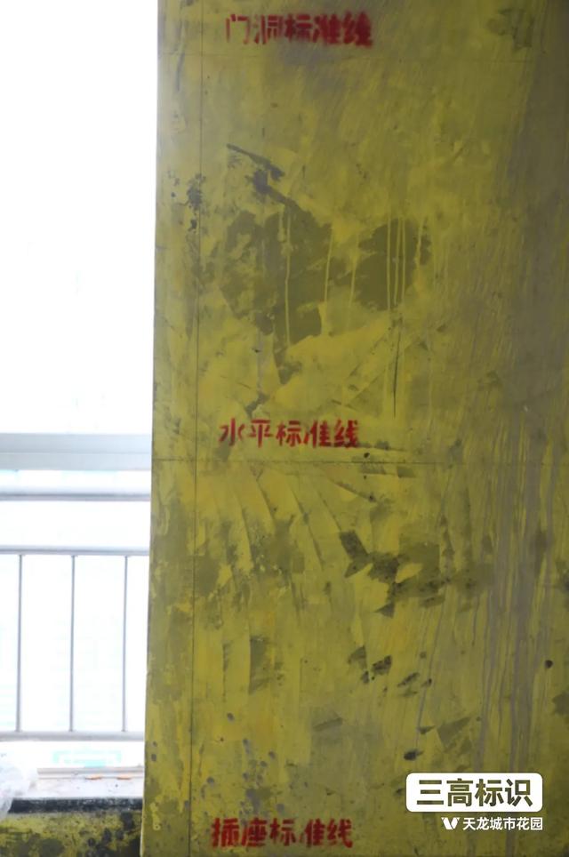 进入客厅,首先查看是否有规范的三高标识,三高是指门洞标准线、水平标准线、插座标准线,通过这三个标识,可以保证工人施工更规范,统一高度也更加美观。