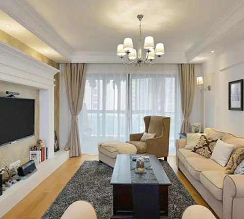 这个别墅装修案例以浅色调为主,米黄色的窗帘和沙发别具一格,让整个别墅装修看起来更温馨。茶几底下灰白色的地毯非常显眼,不但起到防滑防湿的效果,还起到了美观作用。