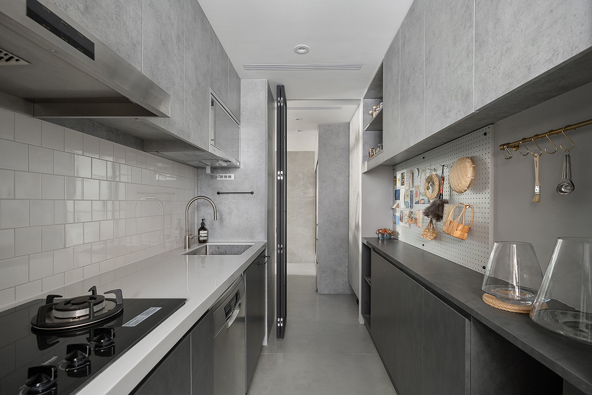中式厨房,利用长虹玻璃门隔断,阻隔油烟,增加空间通透性。厨房采用双排设计,左右两侧均规划了上下储物柜,以保证厨房储物空间的充足。为了更好地收纳厨房器具,右侧加入了洞洞板设计,让物件收归于前面保持台面整洁,也有利于日常使用便利。