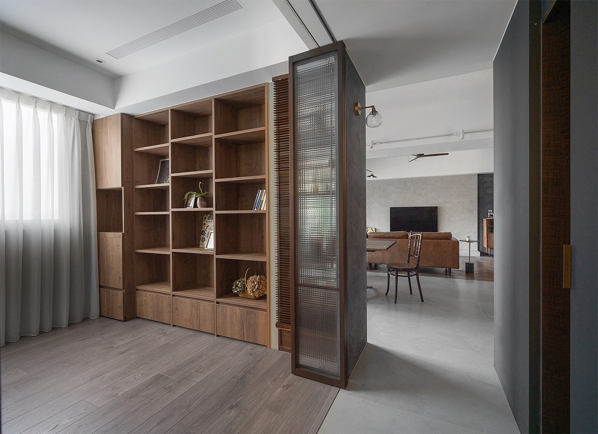 多功能房设计,透过折叠门设计,保持开阔通透的空间感。目前只设计了落地层柜,留有足够的空间,为后期布置提供更弹性的空间。
