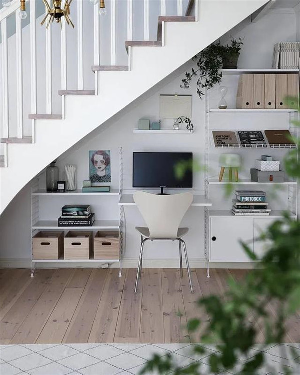 ▼把楼梯下侧改造成书房也很不错,这样就可以省出一间屋子啦。你可以选择定制、或者直接买成品书柜、书桌,看书工作再次全部搞定。多出的一间屋子可以做衣帽间啦,是不是很机智~