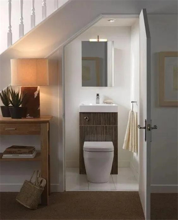 ▼让你想不到的是,楼梯下面的空间还可以做卫生间哦。这个位置的卫生间既方便楼上使用、也方便楼下使用,最最重要的就是节省空间,不浪费资源。