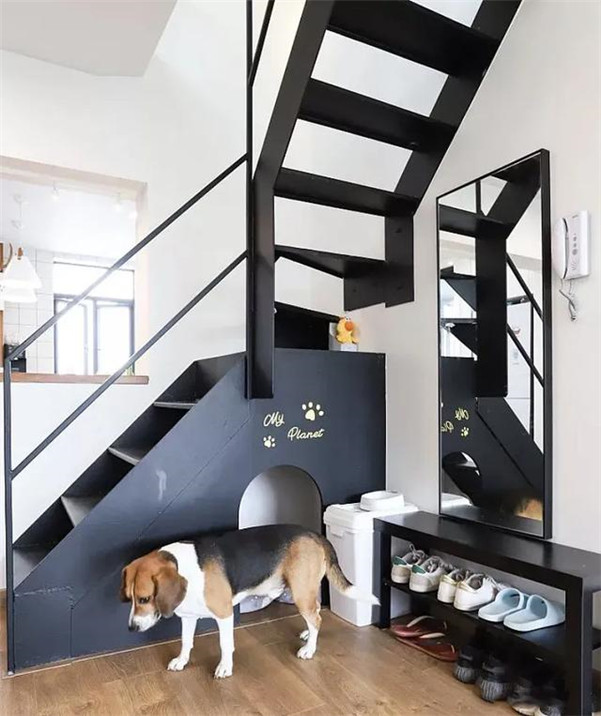 ▼ 毛孩是需要安全感的,在家中为毛孩置办个专属于它的家吧。楼梯下侧的空间经过设计完美打造出宠物的小家。这样毛孩再也不会随处趴着睡觉啦,是不是很温暖啊。