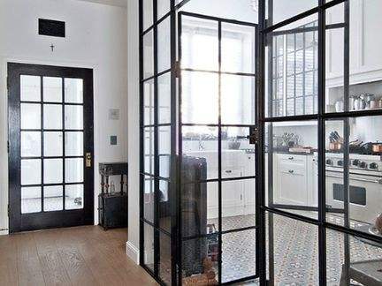 家装厨房门要选择与整体风格搭配的,譬如欧式厨房可以选择白色木质边框与透明玻璃组合的门。