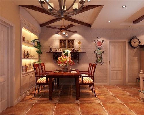 2、美式田园风在材料上,都是选择比较硬、光挺和华丽的材质,而且它的餐厅基本上都是与厨房相连的,这样两个区域连起来就是一个大区域,成为家庭生活的重心。