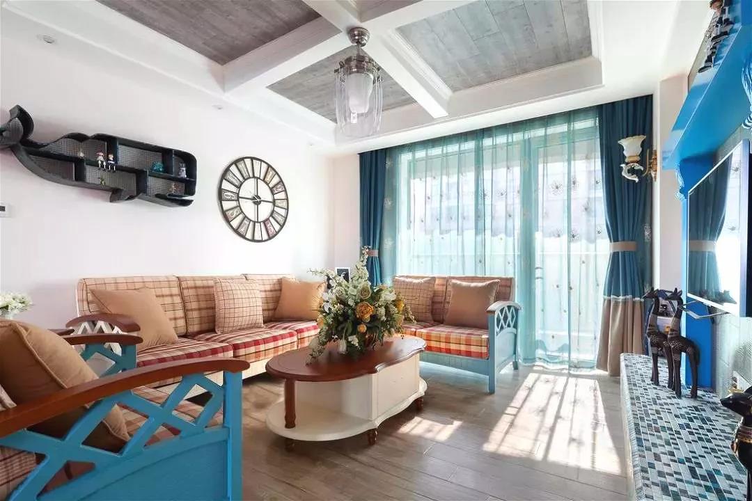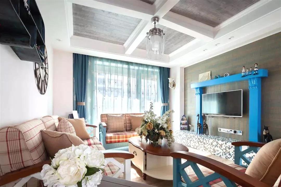 客厅木质沙发、电视背景墙底框刷漆,海蓝落地纱窗的选择都用代表地中海主色调的海蓝色,极具优雅浪漫。