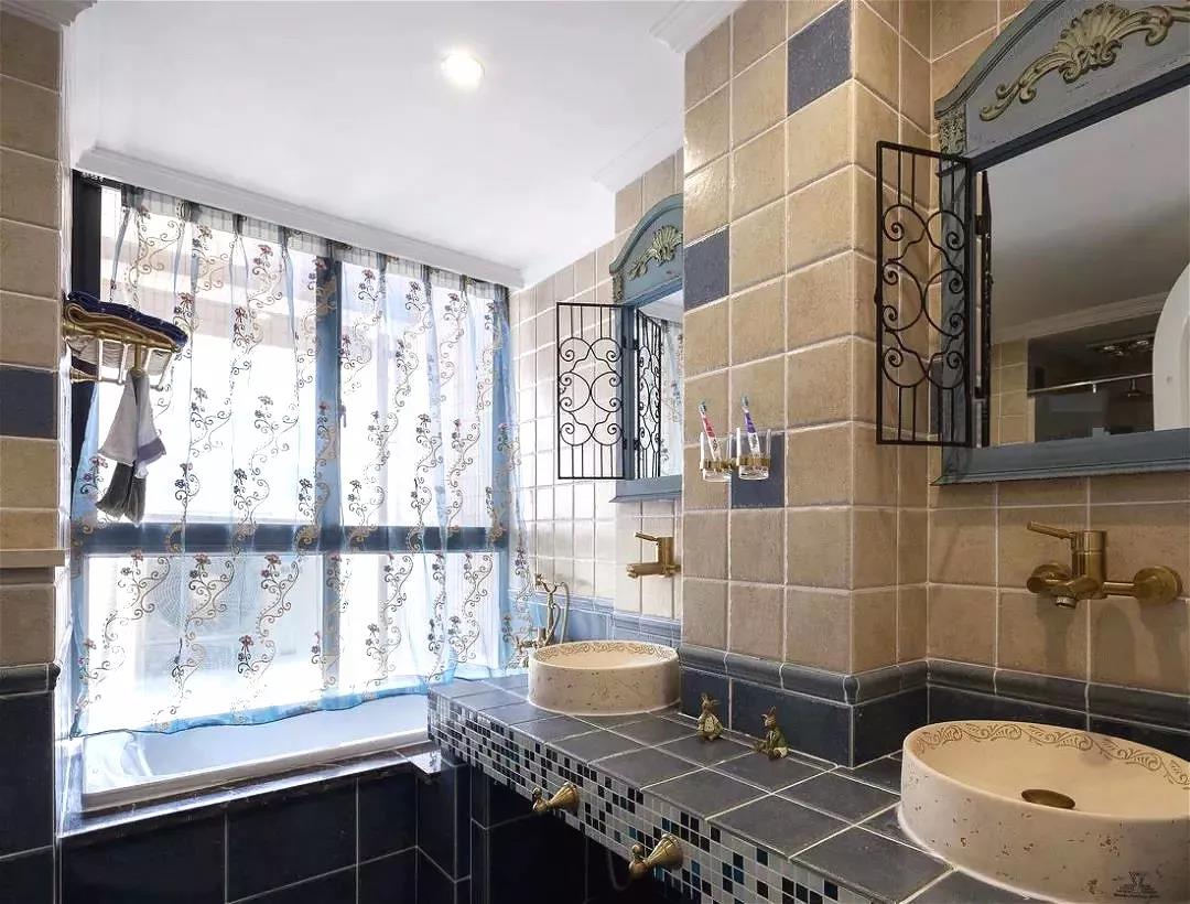 卫生间洗手台双台盆设计,满足双人同时使用,铁窗造型的镜子设计也很有特色。