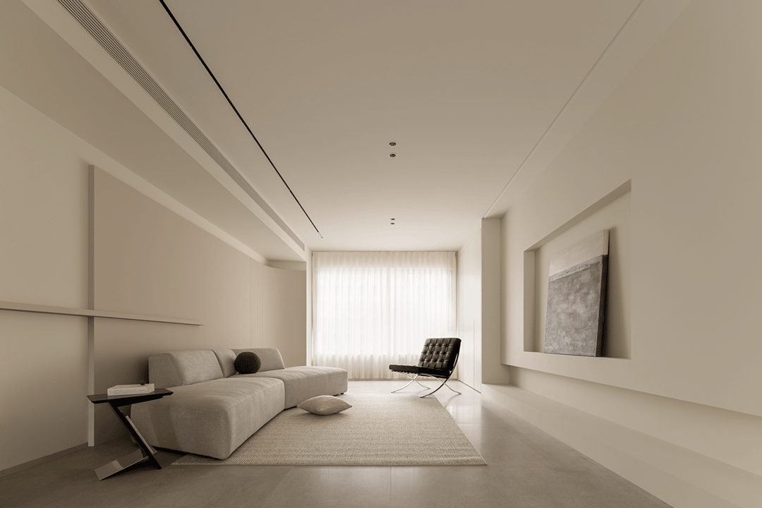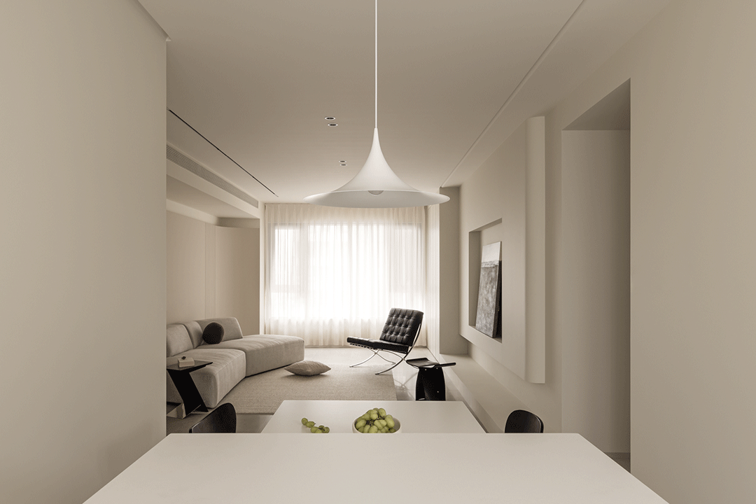 客厅开放式的布局加上统一色调,兼顾功能与视觉层次,材质的温润柔化了空间中的生硬线条。