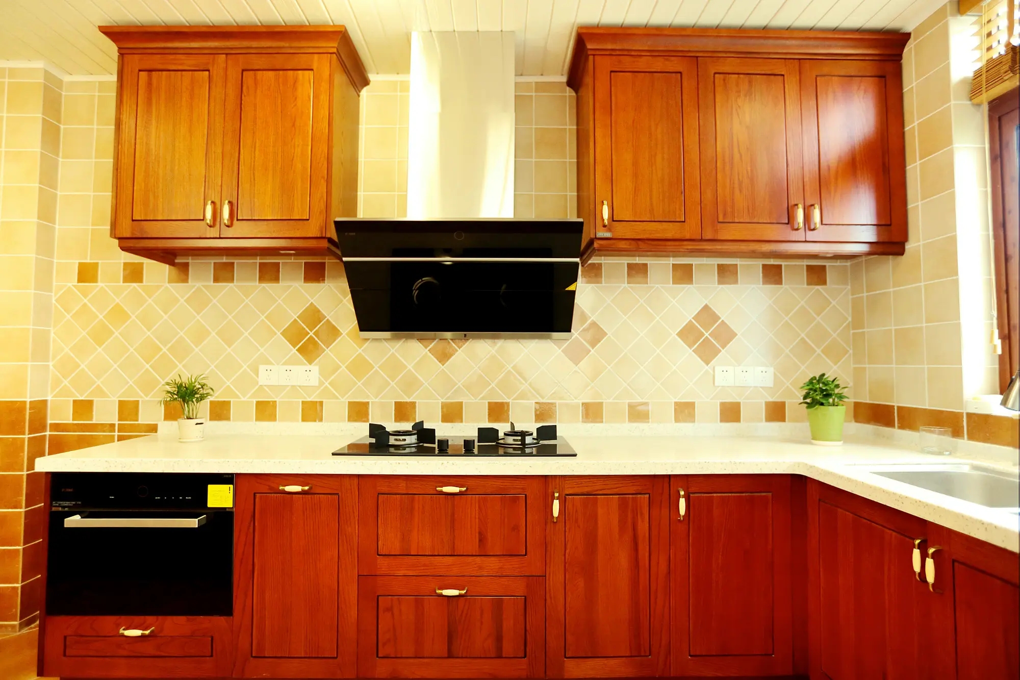 厨房的吊顶采用防水的铝扣板安装,可以避免吊顶因水蒸气或油烟变得潮湿。此外,厨房中尽量不要有夹缝,这样后期容易清理。