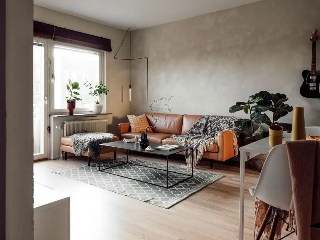 前面也说到了,客厅的面积相对来说是比较小的,为了不让空间在视觉上看上去繁琐有累赘,沙发后的背景墙更是没有做装饰,保持简单整洁的墙面。皮质沙发和木质地板让单调的客厅更有质感,提升空间的格调。