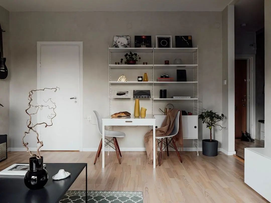 靠墙装置物架,再摆上一张小书桌,平时这里就是朋友简单的书房了。