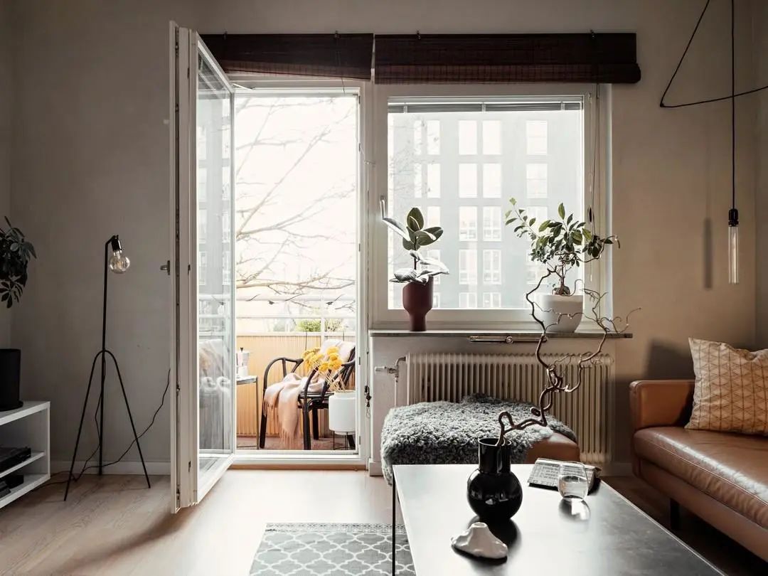 客厅和阳台之间装上平开式的玻璃门,虽然保证了采光,但是这种门也比较占地方,相比推拉玻璃门会更好些。