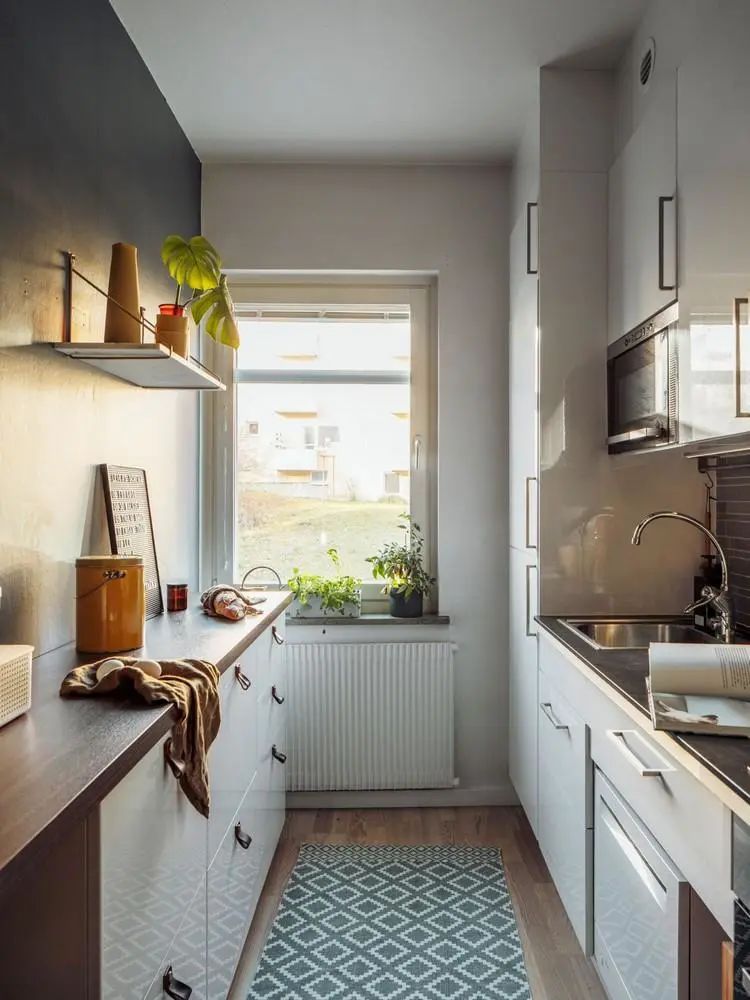 二字形橱柜布局让厨房的使用空间更加丰富,不仅做饭时动线方便,连收纳都翻了倍。靠墙装排小矮橱柜,相当于多个岛台。