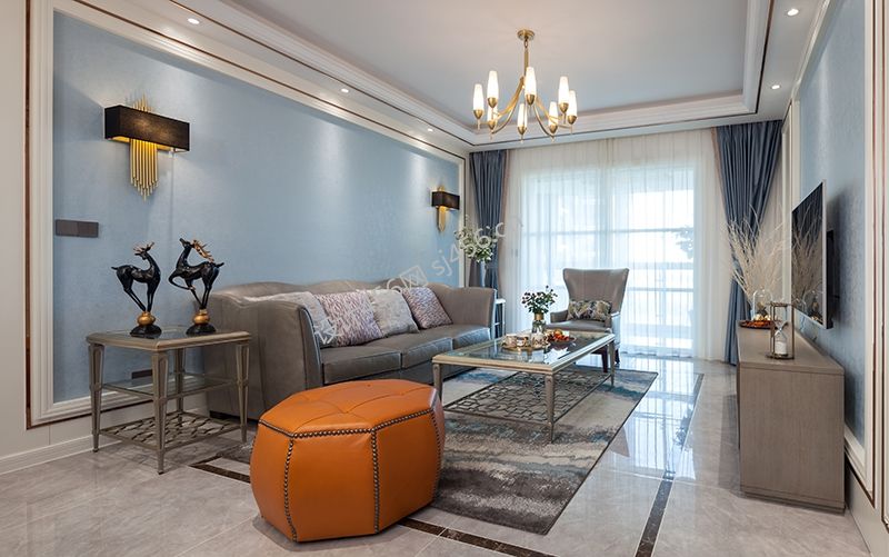 设计理念: 清新明快的蓝色遇见高级灰色,氛围又变得轻快。舒适及满足生活的完美功能性,结合了现代的金属元素,摒弃了繁琐的造型,约束着过于奔放的美式。整体的家具空间色调温馨却又不失典雅与韵味,金属线条的嵌入搭配着全铜吊灯的装饰,让空间更清新典雅。冷色系与暖色系的碰撞,使得炎炎夏日都变得清爽简单。 清新明快的蓝色遇见高级灰色,氛围又变得轻快。舒适及满足生活的完美功能性,结合了现代的金属元素,摒弃了繁琐的造型,约束着过于奔放的美式。整体的家具空间色调温馨却又不失典雅与韵味,金属线条的嵌入搭配着全铜吊灯的装饰,让空间更清新典雅。冷色系与暖色系的碰撞,使得炎炎夏日都变得清爽简单。