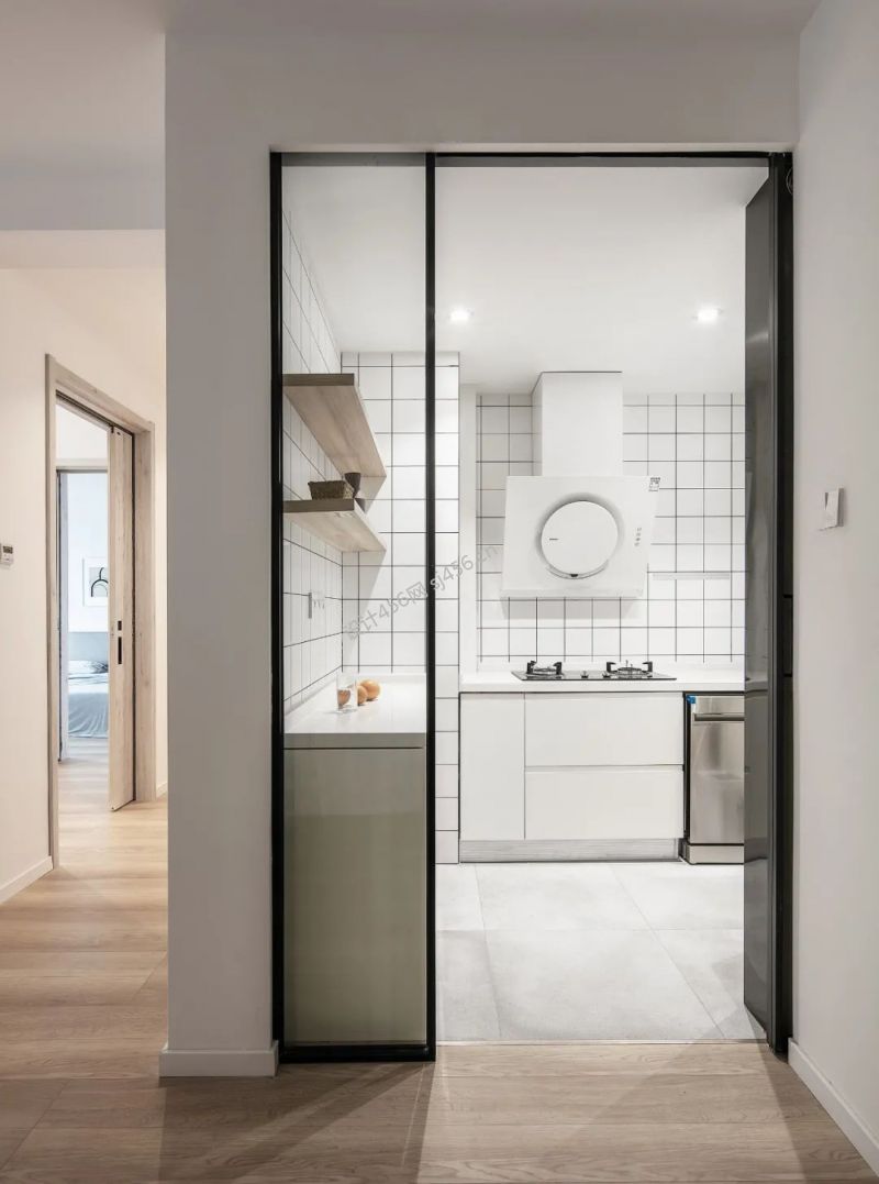 85平米简约原木风二居室厨房隔断墙装修设计图