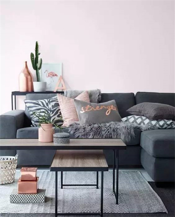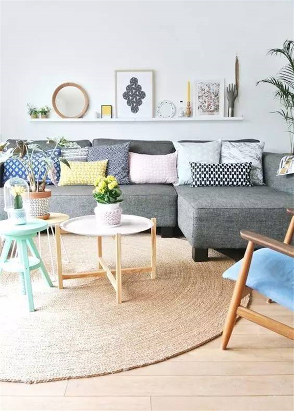 ▲糖果色抱枕、茶几+明亮花卉大叶绿植+多个趣味摆件=明快活力的风格