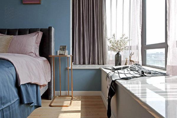 主卧使用大面积的蓝色搭配浅色木地板,无需过多的设计,就能营造出优雅空灵的感觉。融入黑色的软包床,舒适自然。