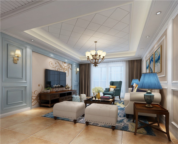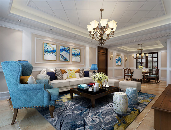 3、整个空间,结合了一些现代元素,像吊顶和油画,这些都是比较现代化的配置。空间的主色调是蓝色,使得整体家居明亮温馨。