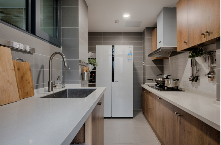 在厨房的布局方面,要兼顾厨具安置、清拆隔断,管线改造等多方面。另外,要按照人体工程学原理,提供科学的厨房工作动线规划,合理安排出厨房用具、方位、尺寸。