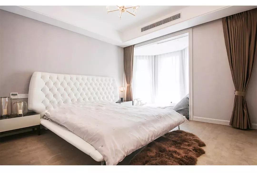 一张白色的大床,原木色的地板,这里营造了更接近于舒适放松的生活的氛围,地上的皮草增加了空间的亲和力,这里调子简单,但并不生硬。