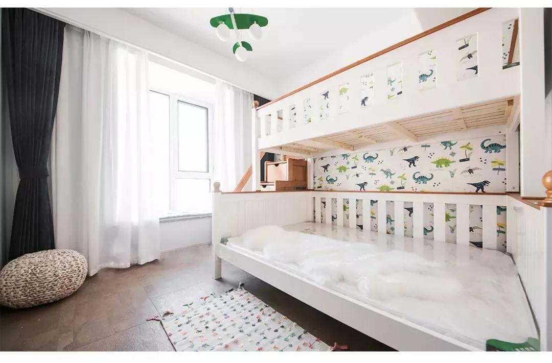 小孩被安排在这里,这里用不同色相的绿保持空间色彩的一致,床头的深棕色实际上预期模拟金色的感受,当然不说人们并不会觉察到什么,也觉得这里和其他地方非常统一,而且活泼可爱。