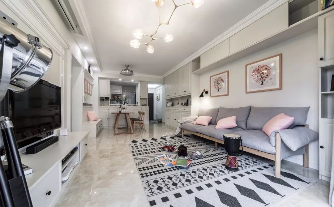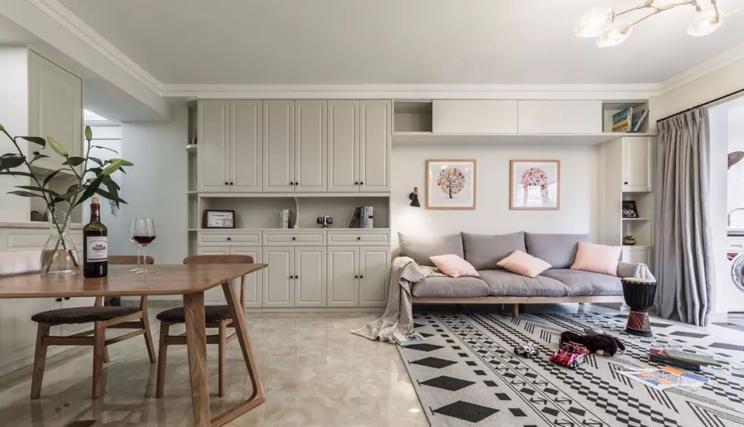 由于玄关的宽度比较窄,鞋柜是放在了客餐厅这个地方,把沙发背景墙也连在一起做柜子,收纳空间会更加宽敞。