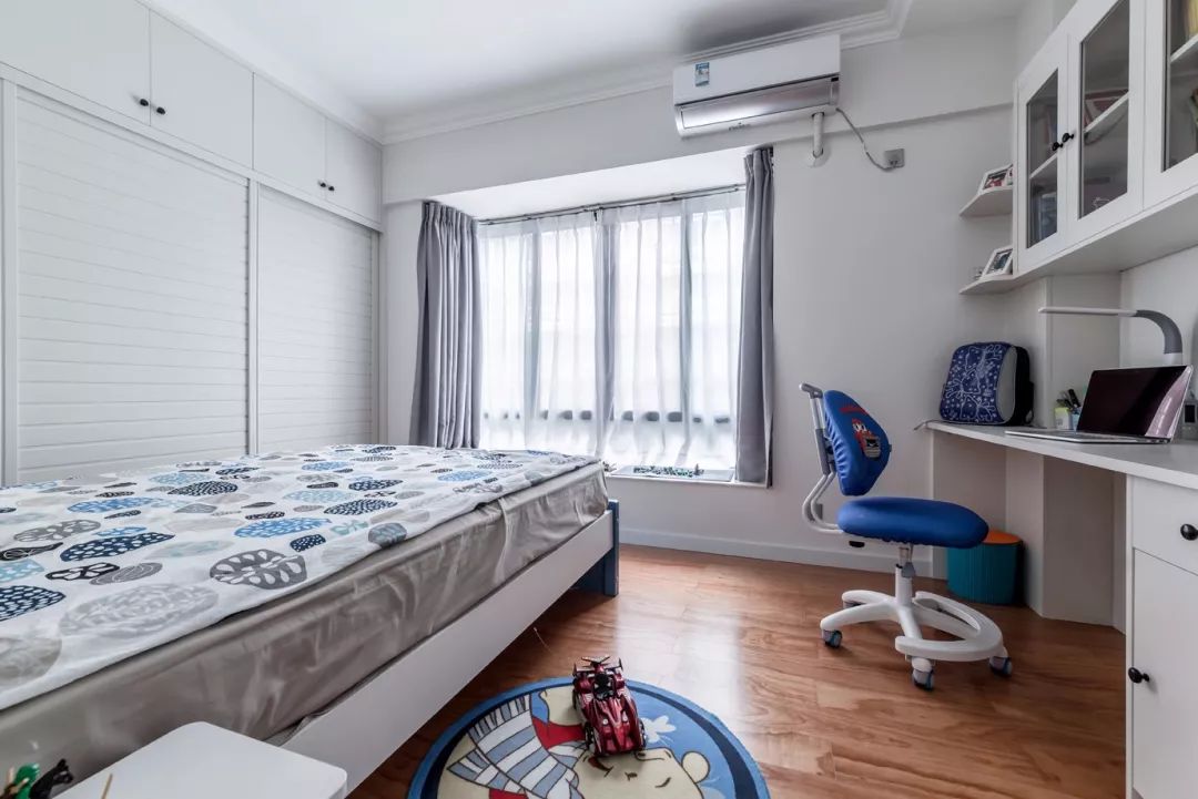 次卧作为孩子的房间,摆放一下张单人床和书桌即可,嵌入式的到顶衣柜非常适合小房间,更省空间。