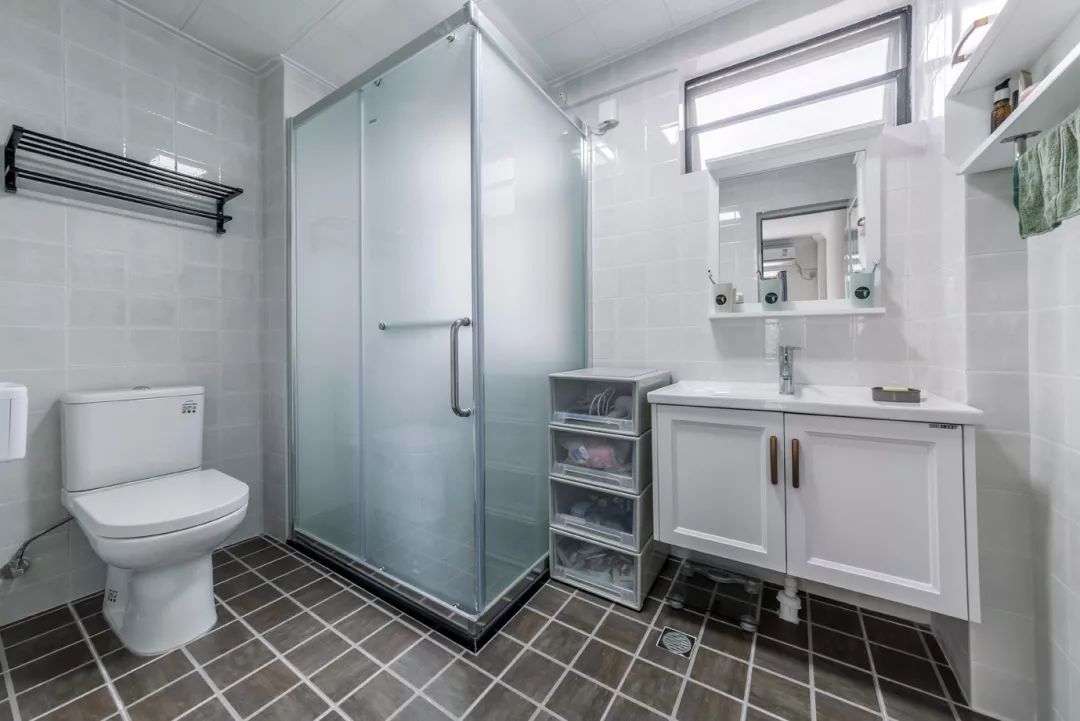 主卫处的淋浴房是做在了角落处,马桶和洗手台分列两侧,这样空间会更为宽敞一些,更适合小卫生间。