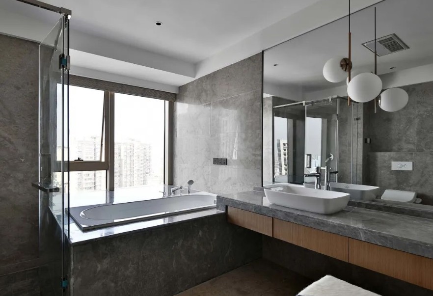 ▲主人卫生间整体比较宽敞,设置了马桶、淋浴房、浴缸与宽大的洗手盆,整体高级灰的配色,也是充满现代时尚的端庄感。