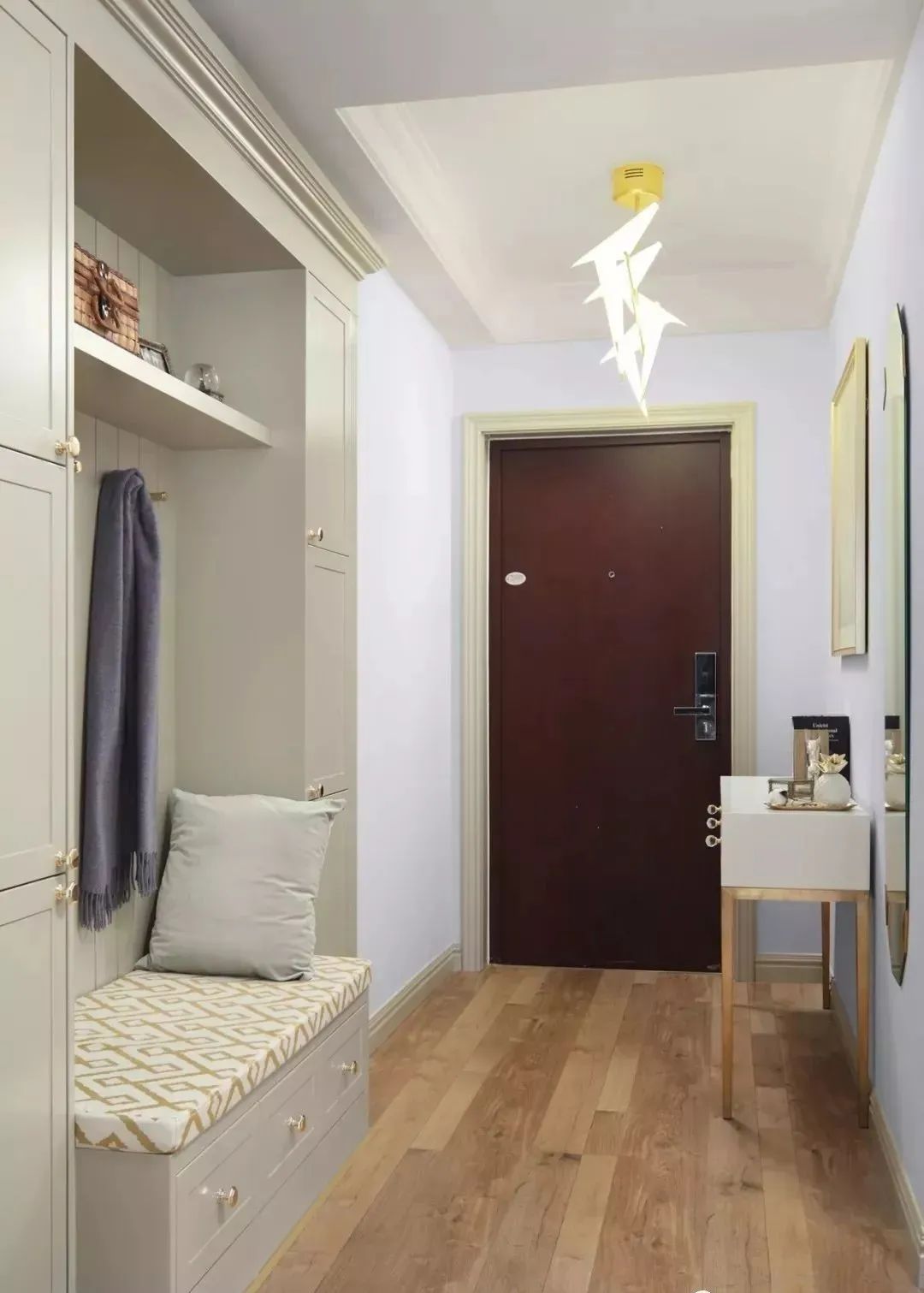 ▲玄关左手放置白色案桌,方便随手置物;右手边定制嵌入式玄关柜,将换鞋凳嵌入进去,并增加挂衣挂包功能,美观实用。