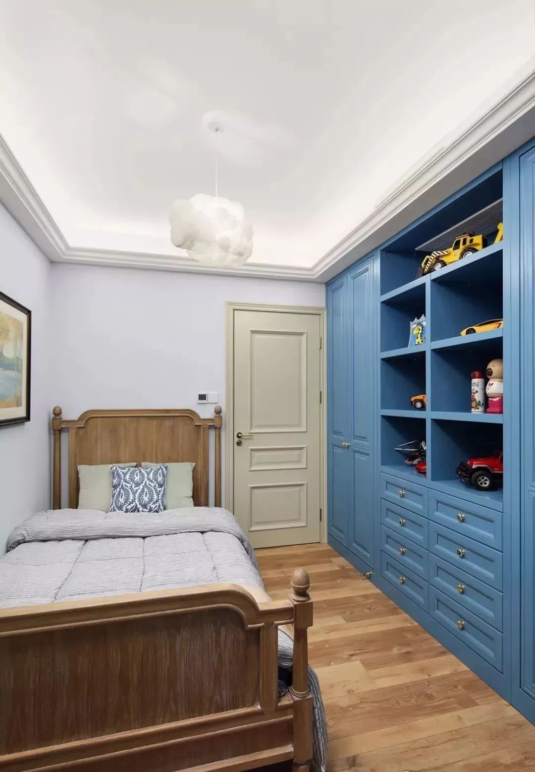 ▲一整面墙的蓝色衣柜,不仅提亮空间,还提供超强收纳空间。灰白墙搭配木地板,加上云朵造型吊灯,带来些许梦幻气息。