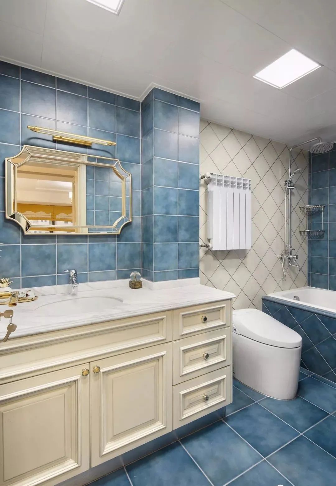 ▲墙地面铺贴蓝色复古瓷砖,搭配米色台盆柜与淋浴区米色墙砖,调和大面积蓝色调带来的冰冷感。