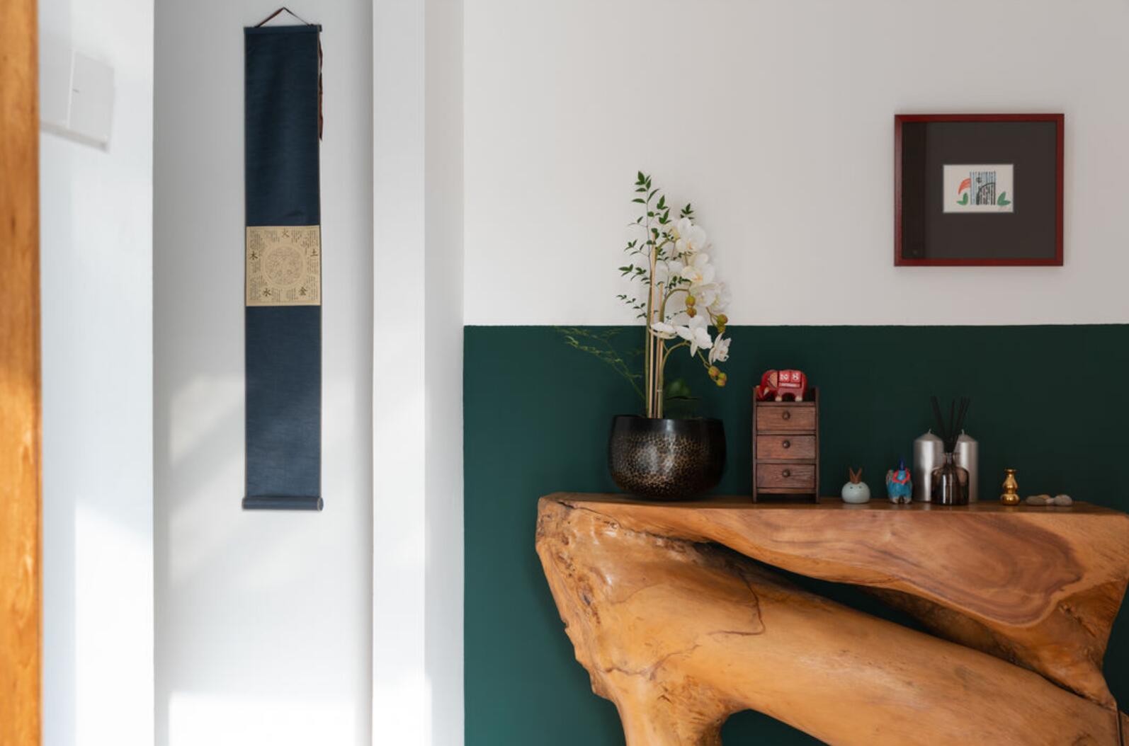 进门的玄关配置了根雕玄关台,下半部的墙面刷了绿色的乳胶漆,古朴又有艺术性。