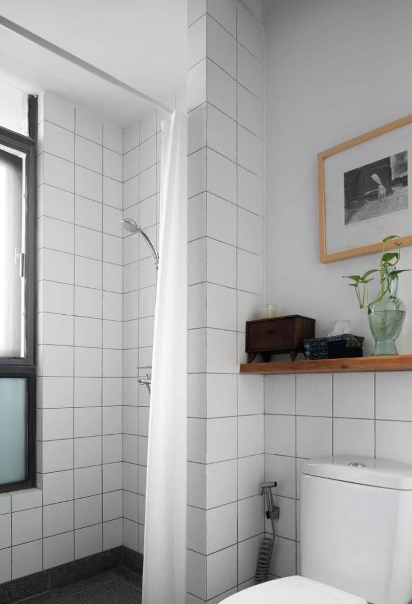 卫生间墙面贴了白色方砖,因为空间比较小,所以舍弃了独立淋浴间,用浴帘来做简单的干湿分离,看起来既干净又清爽。