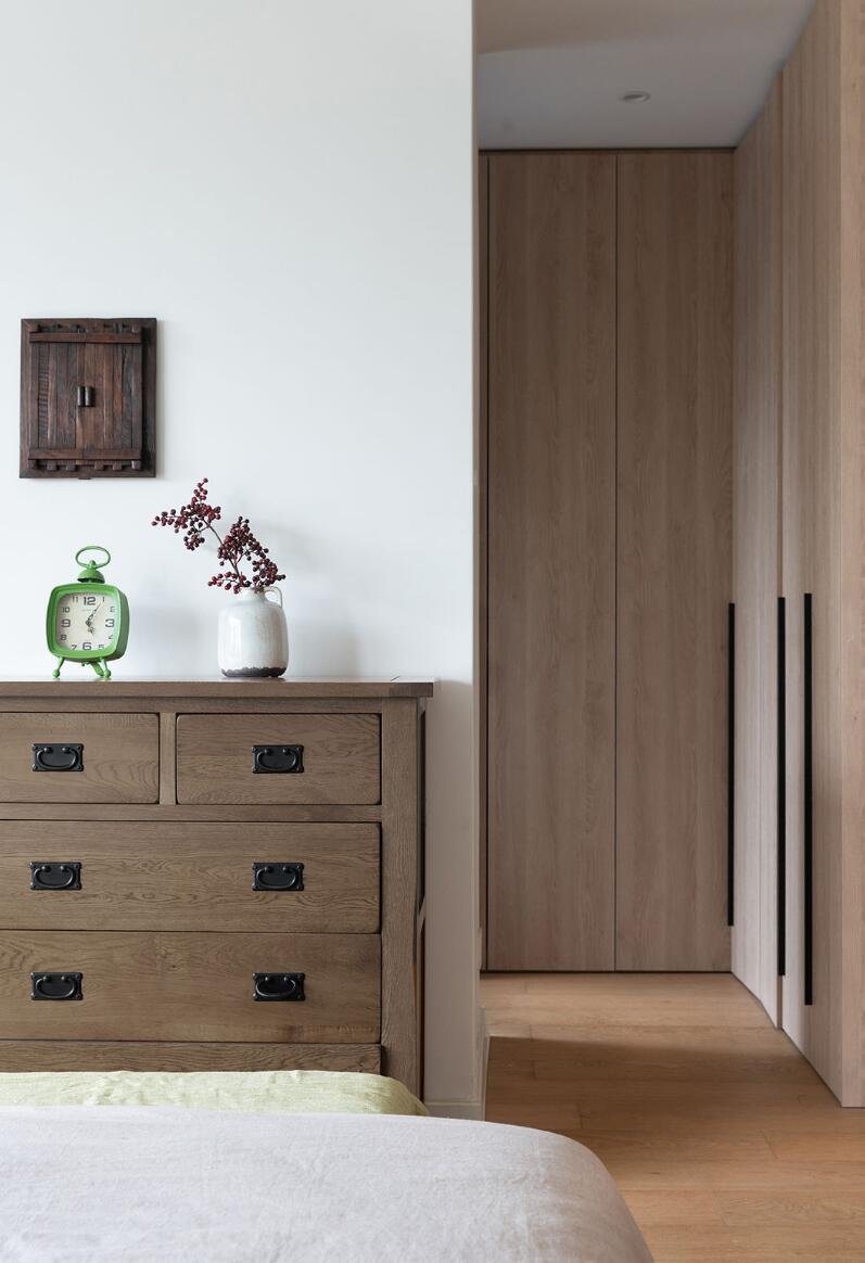 床头对面是独立衣帽间,解决家里收纳,选择五斗柜也会更加实用。