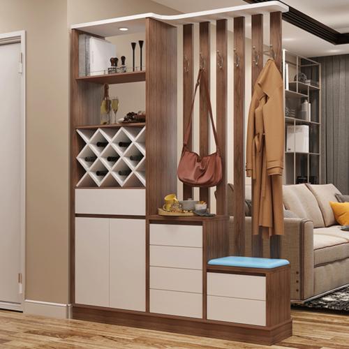 玄关只设计一个低矮的鞋柜是比较浪费的,不妨在鞋柜上部设计一个镂空酒柜,充分利用了有限的空间,但是酒柜高度最 好是不要超过1.8m,太高的话拿酒不方便,所以这个玄关酒柜在藏酒能力方面就比较不足了,适合不善饮酒的家庭使用。