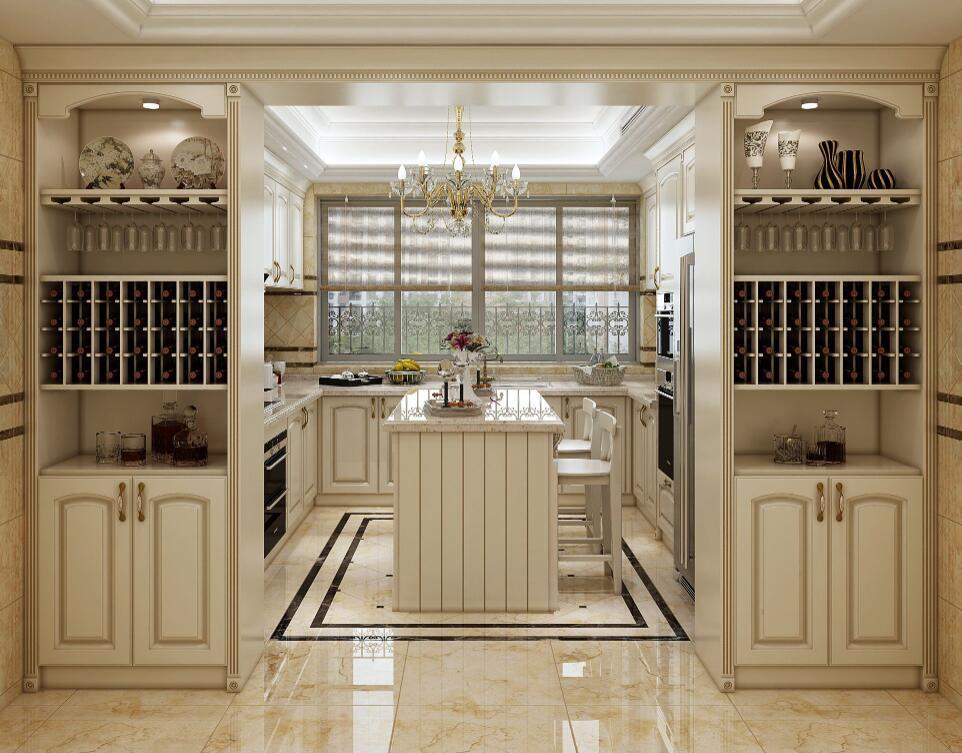 对于爱酒之人,是可以在家中任何区域都设计个酒柜的,客厅、餐厅就不用多说基本上有柜子的区域就可以作为酒柜,所以厨房中的橱柜成为酒柜也就不足为奇了,特别是厨房面积够大的话,可以直接在四周墙面都设计成酒柜,当然仅限于吊柜中,搭配上玻璃柜门就更好看了。