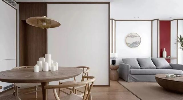 客餐厅相对独立,又彼此相连,克制的设计手法贯穿整个空间。餐桌、吊灯及装饰画,都选择了圆形,有着很好的寓意,而且没有边边角角,空间的流通性也更好。