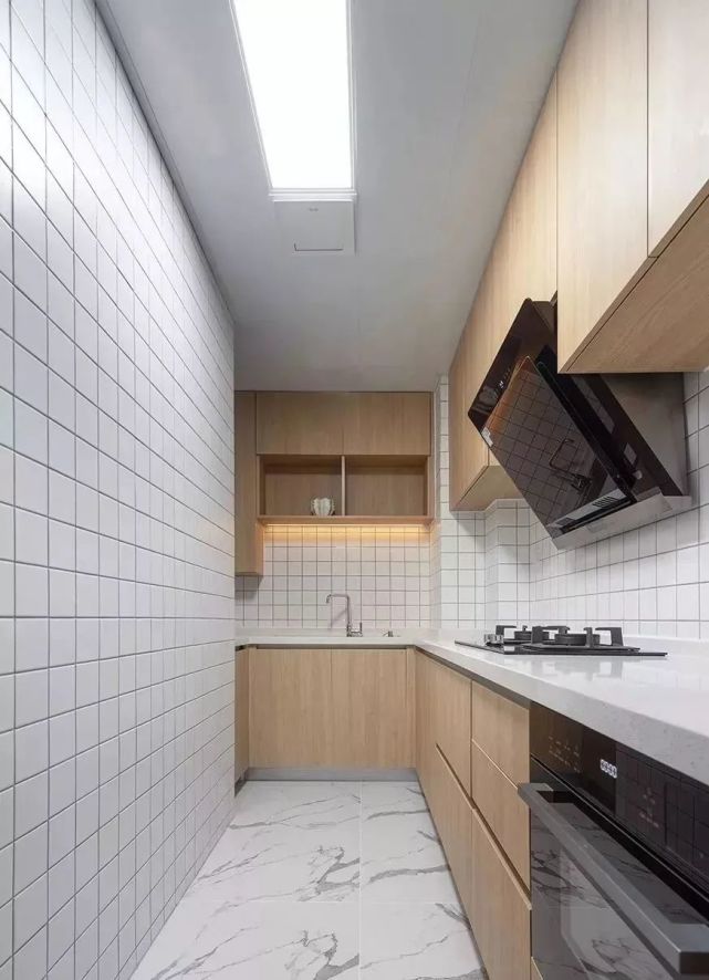 厨房空间一切以实用为先,样式和色调上呼应整体。小方格的墙砖很有气质,让整个厨房空间变得更加简洁大方。