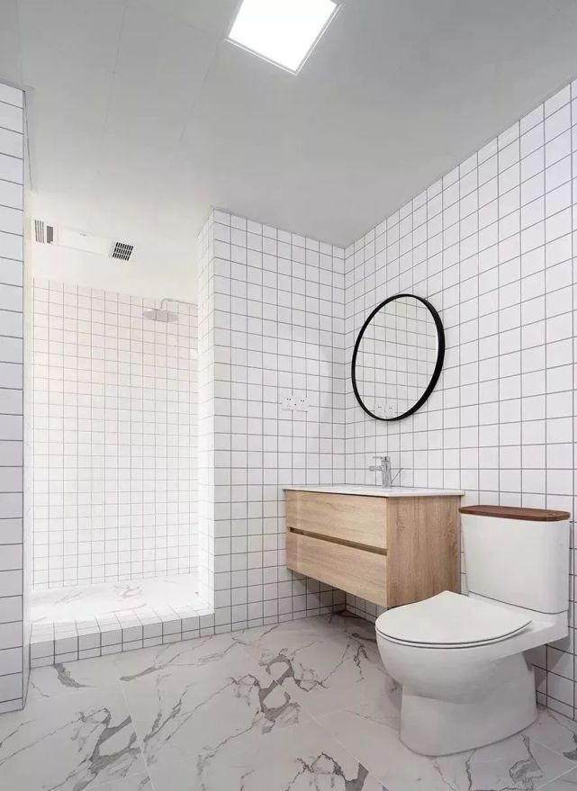 卫生间通过改造后空间变大,一定程度上做到干湿分离,整体浅色调不用过,延续了厨房的小方格的墙砖,整体性更强。