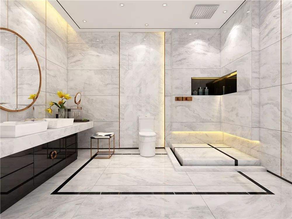 4、墙面贴砖细节:墙面贴砖之前也要做好防潮防水,贴砖时要保证墙面平整,并必需和地砖通缝、对齐,保证墙面与地面的整体感。