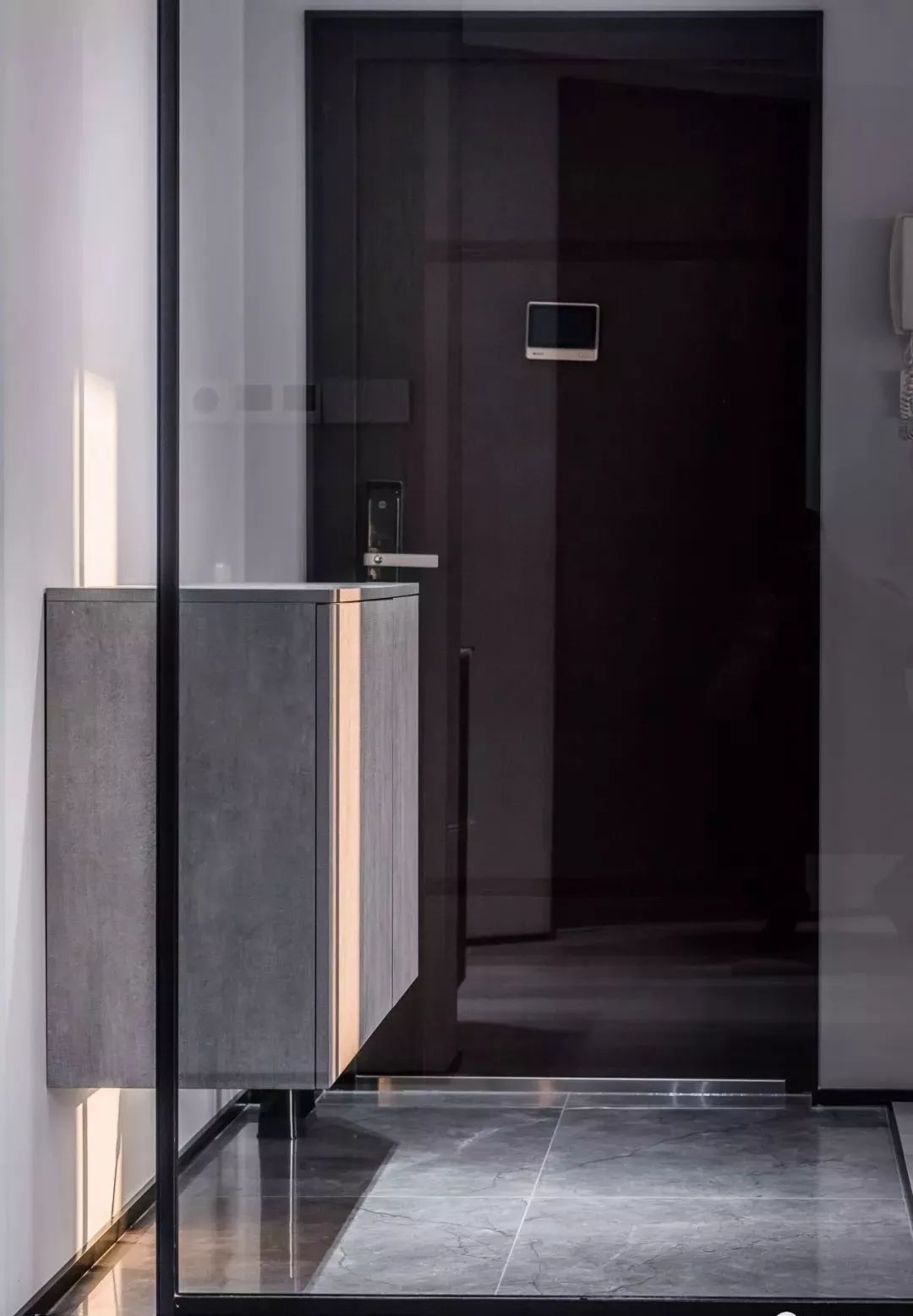 入户玄关没有过多的装饰和改造,一扇黑色大门与大白墙相得益彰,墙面装了一个水泥灰色悬挂式鞋柜,简约大方。玄关处还加装了一扇黑框玻璃门隔断,形成一个独立但通透的玄关区域。