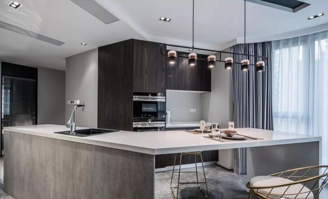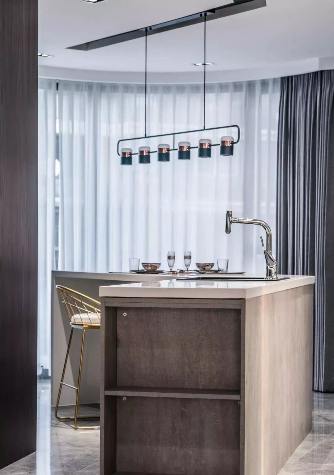 餐厅融入到西厨区,中岛台延伸的部分直接作为餐桌使用,节省空间的同时也足够容纳多人共同进餐,岛台装有水池,可以用来备菜,释放橱柜空间压力。