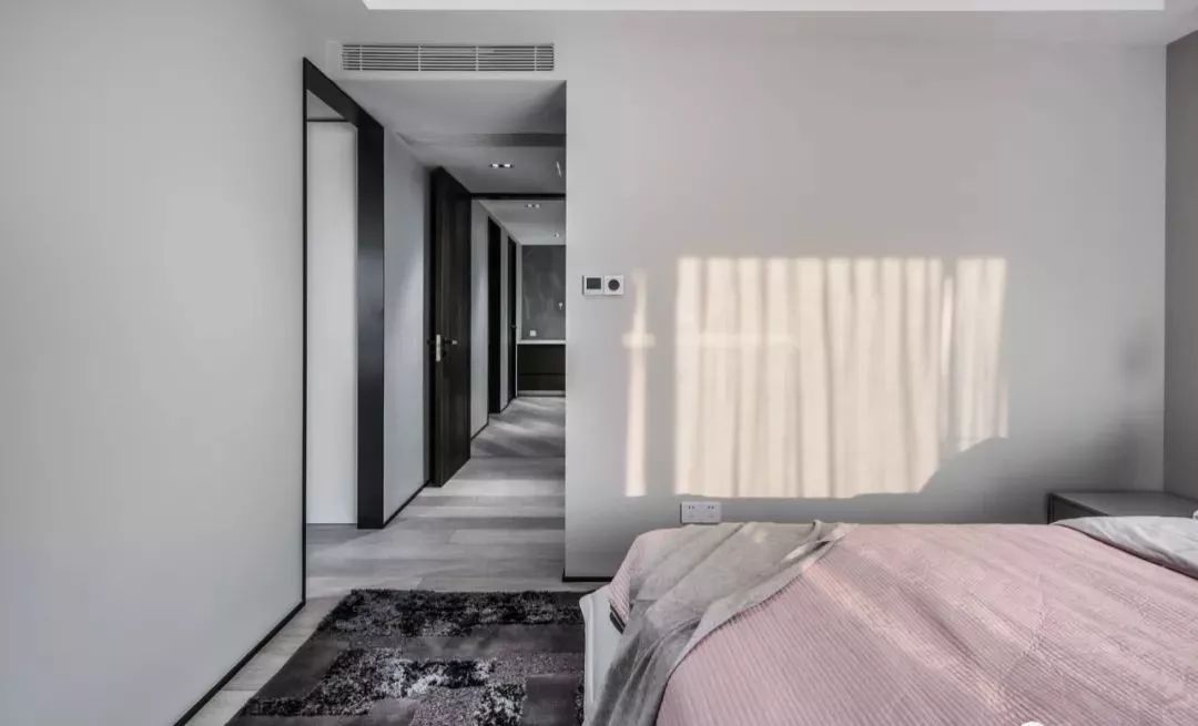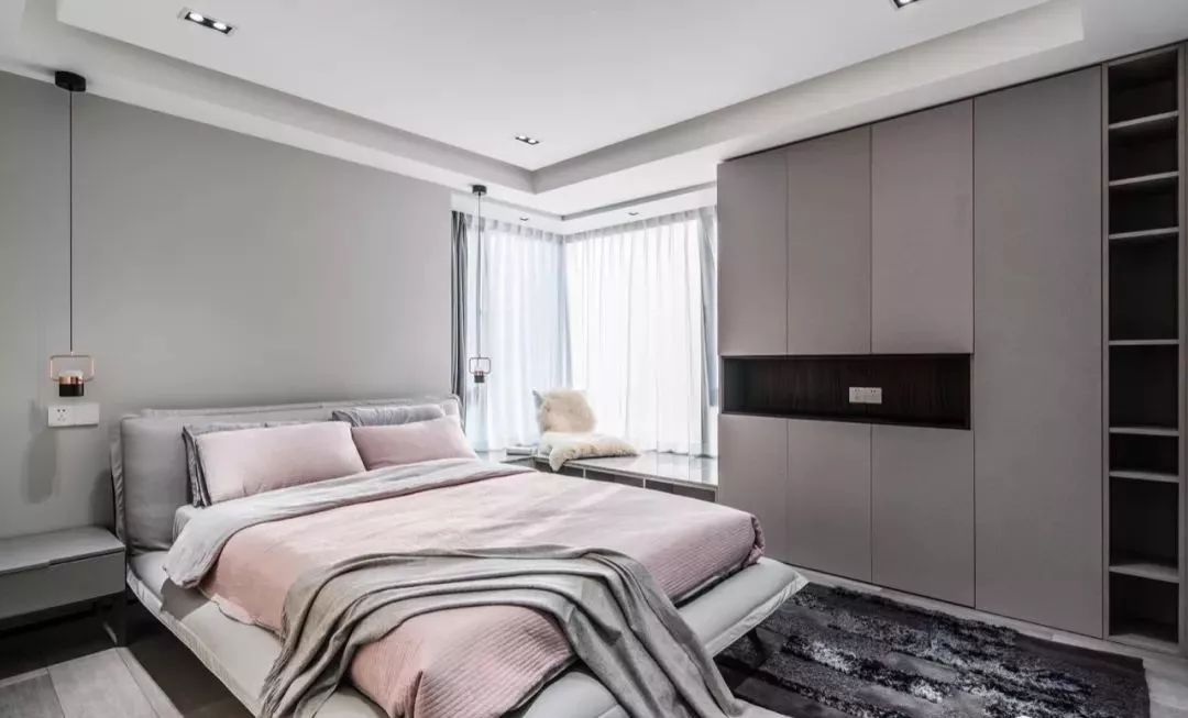 主卧是烟粉色配高级灰,视觉上简约又唯美。对称式的床头布局使空间工整大气,窗边还加装了飘窗,为卧室增加一个休憩的角落。置顶式衣柜收纳功能强大,也保留了一小部分做开放式展示架,美化空间。