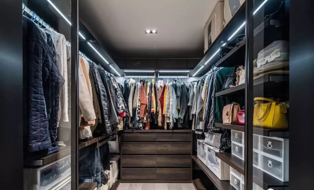 三面的环绕型衣柜,多层次的柜架设计,让各种衣物都有其归属之处。隔板上的隐藏灯带也为衣帽间补充了光源。