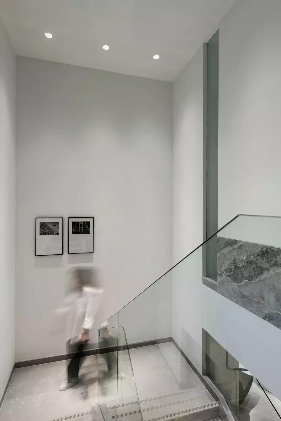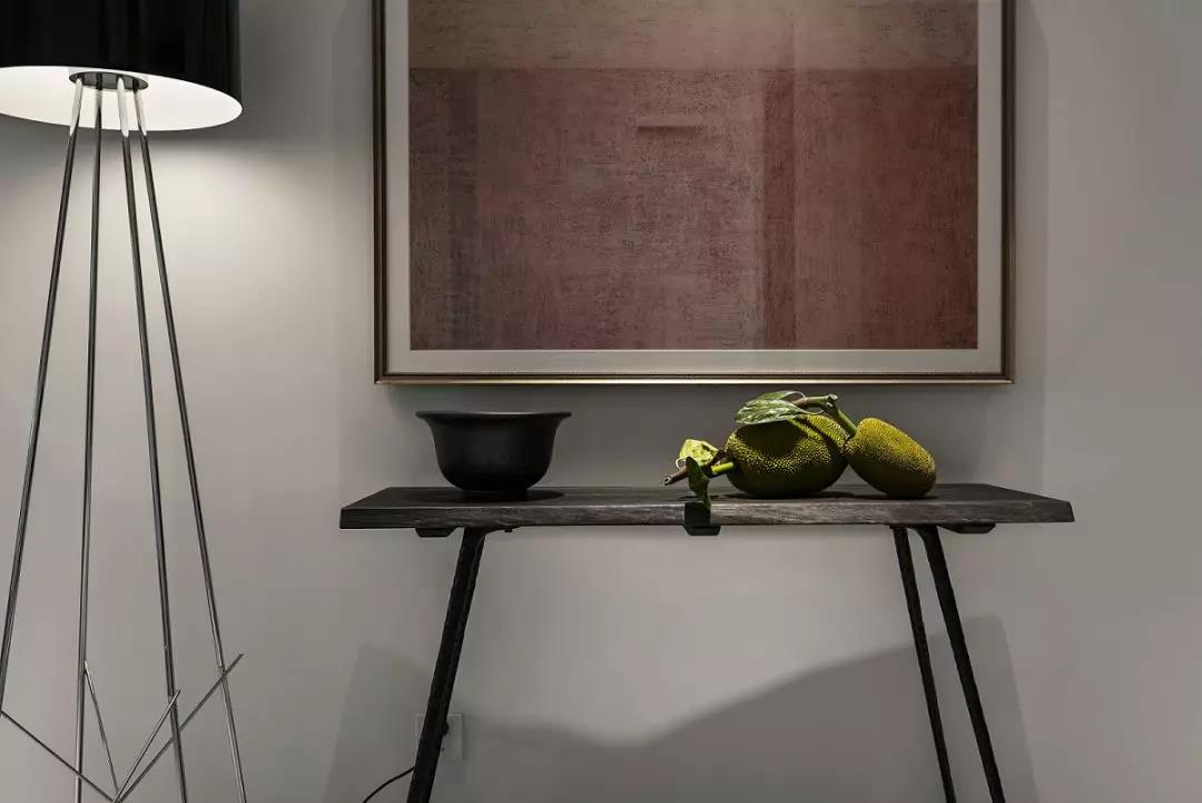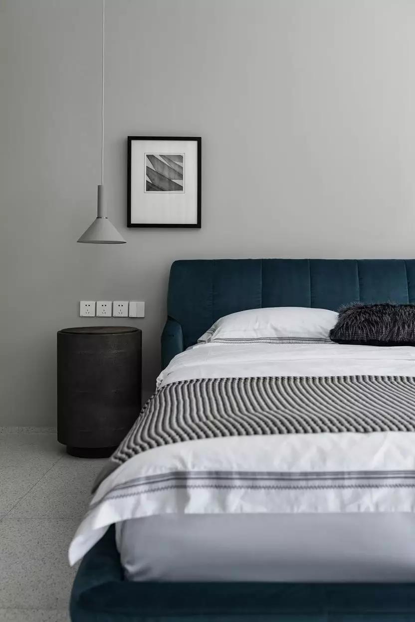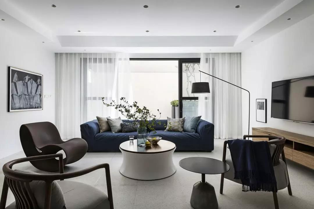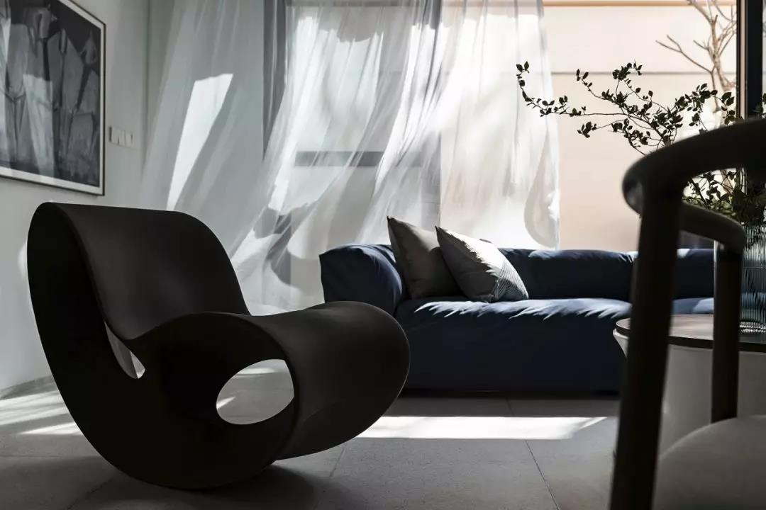 起居厅的蓝色,流露出安定和平静,缓慢舒适的日常在这里展开。这里即是学习和休息的区域,这里也有陪伴与守护。墙上的部分挂画是孩子们的作品,伴随着孩子的成长,家里的某些画面和场景会让他一辈子都不会忘记。