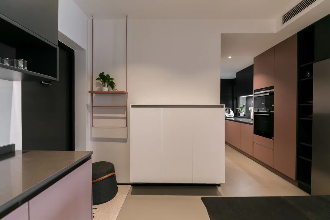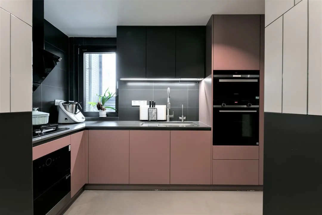 厨房采用开放式格局,整体通透明亮,功能齐全,粉色与深灰色搭配,整体质感十足。吊柜底部安装灯带,无需担心背光问题。